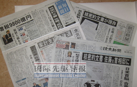《國(guó)際先驅(qū)導(dǎo)報(bào)》記者劉華發(fā)自東京 12月22日,日本《讀賣新聞》晚報(bào)在頭版頭條刊文稱,一份由美國(guó)前總統(tǒng)尼克松和日本前首相佐藤榮作簽署的有關(guān)日美兩國(guó)“核密約”的文件,一直保存在日本前首相佐藤榮作的舊宅。