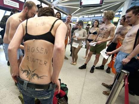 他們身著很少的衣服,一些人還在自己裸露的皮膚上寫著:誰來保護我們的隱私?他們還在微型博客網站Twitter上寫道:“你們無需對我們進行安檢了,因為我們已經赤身裸體了。”
