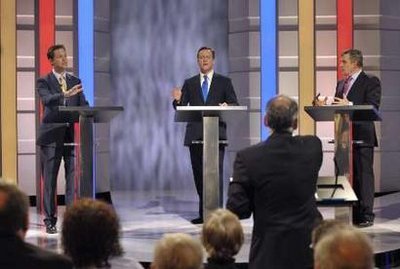 中新網(wǎng)4月16日電 據(jù)法新社報(bào)道,英國三大政黨黨首15日舉行英國有史以來首場選舉電視辯論,事前不那么被看好的自由民主黨黨首克萊格爆冷贏得首場辯論,在辯論后的民意調(diào)查當(dāng)中戰(zhàn)勝執(zhí)政黨工黨黨首布朗和在野保守黨黨首卡梅倫。