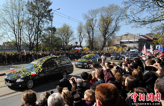 卡欽斯基夫婦的遺體昨日早上從首都華沙,運(yùn)抵克拉科夫,當(dāng)靈車緩慢駛過(guò)時(shí),道路兩旁的民眾獻(xiàn)上鮮花致敬。于當(dāng)?shù)貢r(shí)間下午2時(shí),在汽笛和教堂鐘聲之下,圣母大教堂的葬禮正式展開(kāi),在教堂外,數(shù)以萬(wàn)計(jì)的波蘭人民聚集,透過(guò)大銀幕上的直播參與葬禮。其后,卡欽斯基夫婦的棺木被運(yùn)往瓦維爾宮,接受21響禮炮致敬和安葬,與多位帝王英雄同葬一地。