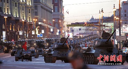 據(jù)報(bào)道,27日,俄羅斯出動(dòng)約159輛軍用車輛及1萬(wàn)多名軍人,進(jìn)行了關(guān)于今年5月9日俄羅斯衛(wèi)國(guó)戰(zhàn)爭(zhēng)“勝利日”65周年時(shí),紅場(chǎng)閱兵儀式的彩排活動(dòng)。此次閱兵分為兩部分:歷史部分和現(xiàn)代部分。歷史部分由身穿衛(wèi)國(guó)戰(zhàn)爭(zhēng)時(shí)期軍服的士兵游行,同時(shí)還會(huì)有9輛T-34坦克和8輛SU-100自行火炮進(jìn)行在游行隊(duì)伍當(dāng)中。現(xiàn)代部分則由13輛老虎裝甲車、BTR-80裝甲車、BMP-3步兵戰(zhàn)車、T-90A坦克和S-400防空系統(tǒng)等組成。