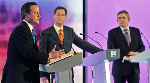 工黨領(lǐng)袖布朗、保守黨領(lǐng)袖卡梅倫和自由民主黨領(lǐng)袖克萊格分別就削減財(cái)政赤字、減少稅收、銀行監(jiān)管和英國制造業(yè)等一系列問題交鋒。