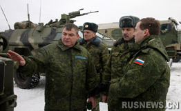 中新網(wǎng)1月15日電 據(jù)俄新網(wǎng)14日?qǐng)?bào)道,俄羅斯總統(tǒng)德米特里·梅德韋杰夫由國(guó)防部長(zhǎng)陪同在莫斯科州參觀了新式履帶式裝甲運(yùn)輸車。
