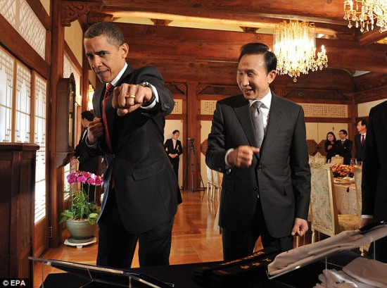 雙方會(huì)晤之后,李明博將一套跆拳道制服和一條黑帶作為禮物贈(zèng)予奧巴馬,奧巴馬隨即擺開(kāi)跆拳道姿態(tài),大展拳腳,韓國(guó)總統(tǒng)李明博在一旁贊賞不已。據(jù)悉,2001年,奧巴馬還是伊利諾伊州一名參議員時(shí),就開(kāi)始了為期4年的武術(shù)學(xué)習(xí)。