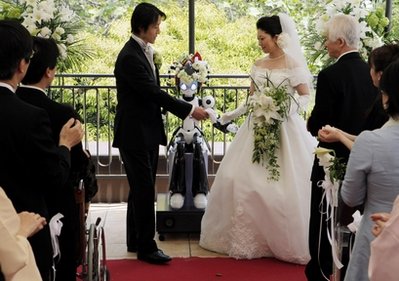 這款高約1.5米的機(jī)器人身體主要是白色,頭戴花環(huán),還有兩根塑料辮子。“她”的眼睛可以閃爍,也可以用她細(xì)細(xì)的嗓音說(shuō)出“你可以揭開新娘的面紗了”之類的話語(yǔ),主持起婚禮是有模有樣。