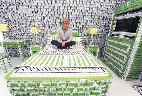 洲際酒店集團為宣傳假日酒店的一家分店在翻新后重新開幕,委托伯格為在紐約建造這家“鎖匙卡酒店”。它已在17日開幕,只會經(jīng)營5天。全店只有一個睡房、一個浴室和一個大堂,面積只有約37平方米,重量只有兩噸。但它的賣點在于伯格那瘋狂的創(chuàng)意和手藝:店內的睡床、接待處、桌椅……所有的家俬都是由酒店鎖匙卡搭成,體積與一般家俬無異。