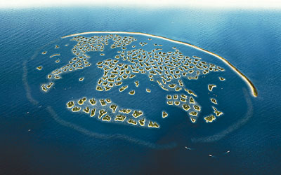 “世界島”是世界上最大的人造海島,用300個(gè)形狀模仿世界各大洲的人工島嶼,組成一個(gè)微縮版地球,每個(gè)島嶼的面積從2300平方米到8360平方米不等。島上設(shè)有酒店以及各種休閑旅游設(shè)施。4座人工島在太空都清晰可見(jiàn),堪稱(chēng)現(xiàn)代“世界第八大奇跡”。