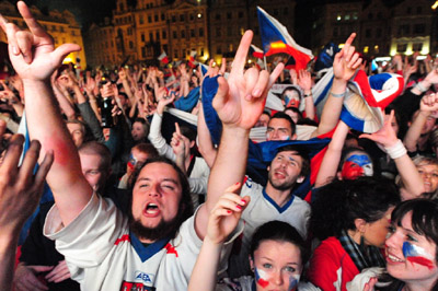 數(shù)千名球迷23日晚上聚集在布拉格市中心老城廣場觀看球賽的電視實況轉(zhuǎn)播,捷克隊最終取勝后人們一片歡騰。(黃頻)
