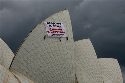據(jù)報道,在哥本哈根召開的氣候峰會上,發(fā)達國家和發(fā)展中國家兩大陣營之間仍在僵持,各界對峰會結(jié)果的悲觀情緒彌漫會場。15日,5名綠色和平組織成員抓著繩索爬上了悉尼歌劇院,并拉開一個100平米大的條幅,上面寫著“不要再玩政治——立刻達成氣候協(xié)議”。事后,這5人被警方逮捕。
