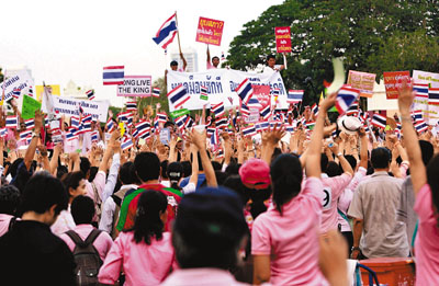 這批“粉衫軍”包括來自曼谷朱拉隆功大學(xué)的師生、旅游業(yè)者和“和平網(wǎng)絡(luò)”組織的成員,有人稱他們?yōu)椤胺奂t運動”。在前副警察總長瓦西和朱拉隆功大學(xué)政治科學(xué)系主任乍叻帶領(lǐng)下,他們昨日在倫披尼公園內(nèi)的拉瑪四世像前宣誓,矢言保護國家,同時聯(lián)署請愿信,反對解散國會和修改憲法,指此舉不符合國家最佳利益。