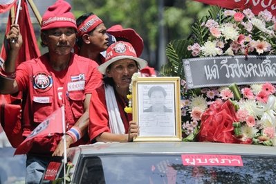 紅衫軍一名領(lǐng)導(dǎo)人稱,他們抬著11個(gè)棺材進(jìn)行游行,里面放著死于周六暴力沖突的喪生者遺體。泰國政府部門稱,當(dāng)天有4名軍人和17名平民死亡,政府周一將對(duì)9具尸體進(jìn)行尸檢。