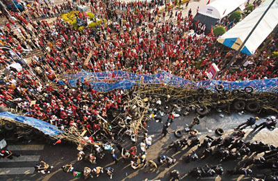 榴彈襲擊翌日,數(shù)百名防暴警察手持盾牌警棍,沒有攜帶槍械,向購物區(qū)的紅衫軍集結(jié)點推進。紅衫軍用尖竹和車胎堆成3米高的路障,并灑上汽油,迫使警方退后。紅衫軍后來答應(yīng)警方要求,后退100米,但并未拆除路障。