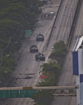 軍方擴大了對紅衫軍聚集區(qū)的封鎖范圍,并使用擴音器呼吁在這一區(qū)域內的所有人返家。昨晚有傳聞軍方將展開清場行動,今晨仍能聽到零星槍聲。
