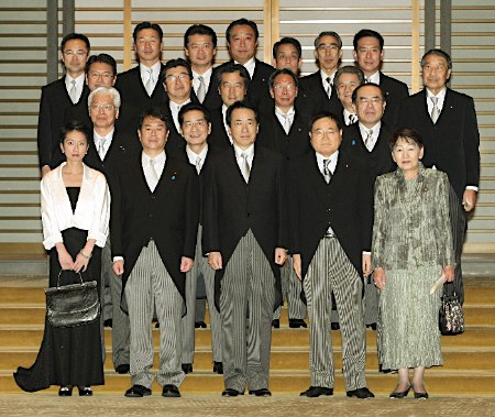 前任鳩山內(nèi)閣中,有11名大臣留任,包括外務(wù)相岡田克也、防衛(wèi)相北澤俊美、國土交通相前原誠司和郵政和金融事務(wù)擔(dān)當(dāng)相龜井靜香。官房長官則由前國家戰(zhàn)略擔(dān)當(dāng)相仙谷由人轉(zhuǎn)任。首次入閣的有公務(wù)員制度改革擔(dān)當(dāng)相玄葉光一郎、行政改革擔(dān)當(dāng)相蓮舫、財(cái)務(wù)相野田佳彥等5人。反小澤“先鋒”枝野幸男則繼任黨干事長。