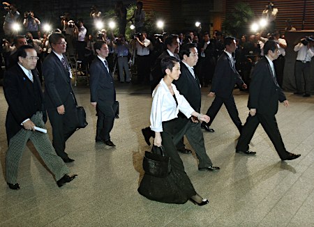 8日晚,日本天皇在天皇宮中舉行儀式,任命菅直人擔(dān)任日本新首相,同時一一任命了其它17名大臣。天皇對每一位大臣說:“肩負(fù)重責(zé),辛苦你了”。