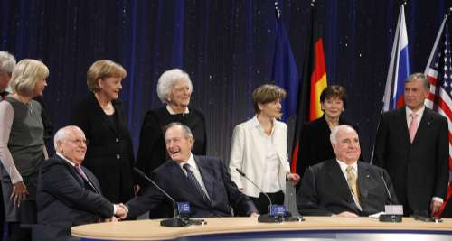 紀(jì)念活動(dòng)主辦方贊揚(yáng)老布什與戈?duì)柊蛦谭蚍秩蚊捞K領(lǐng)袖時(shí),對拆除柏林墻及促成兩德統(tǒng)一的貢獻(xiàn),還贊揚(yáng)德國前總理科爾“抓住關(guān)鍵的一刻”,促成德國統(tǒng)一。