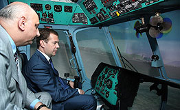 Tranzas公司方面向梅德韋杰夫展示了為專業(yè)飛行員制造的高級訓練臺。它能夠模擬在俄羅斯最受歡迎的米格-8型直升機的飛行。公司學習部門的主任葉甫蓋尼·阿巴庫莫夫和梅德韋杰夫一起坐在米格-8直升機的方向盤前,在圣彼得堡阿德列爾機場最不利的條件下進行了一次駕駛。