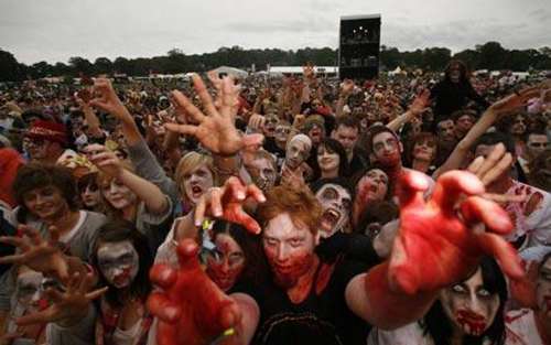 這幕駭人畫面出現(xiàn)在該市舉行的大寒音樂節(jié)(Big Chill festival)上,共有4026人把自己打扮成形狀可怖的僵尸。他們還參與了一部僵尸片的拍攝。不過,主辦單位相信實際數(shù)目遠不止此,因為還有很多人沒有填寫表格。