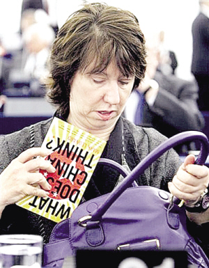當(dāng)?shù)貢r(shí)間9日,歐盟女外長(zhǎng)阿什頓出席歐洲議會(huì),入場(chǎng)坐定后,就從包里掏出一本名為《中國(guó)怎么想》的書(shū),這一瞬間剛好被美聯(lián)社記者的快門捕捉下來(lái)。