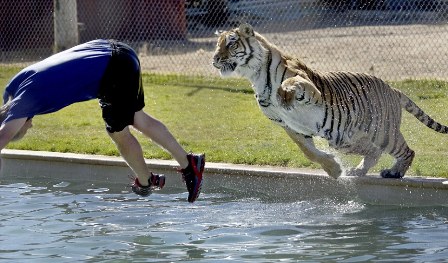 游戲一直很安全地進行。一只老虎的體重可達到47英石(約300公斤重),但嬉戲時它不會伸出爪子去抓人。泳池里也總是有2名管理員隨時關注情況,不讓樂趣變成悲劇。