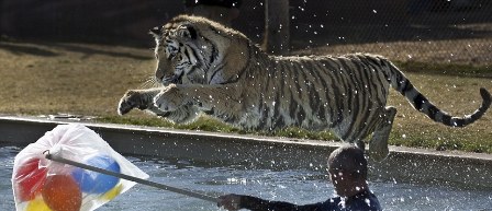 游戲一直很安全地進行。一只老虎的體重可達到47英石(約300公斤重),但嬉戲時它不會伸出爪子去抓人。泳池里也總是有2名管理員隨時關(guān)注情況,不讓樂趣變成悲劇。