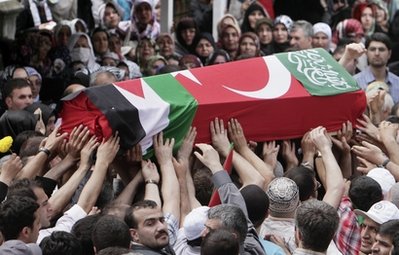 周四(3日),九名死者的尸體被從以色列運回土耳其。450多名活動人士也一同抵達,他們受到英雄般的歡迎。九名死者都是土耳其人或出生在土耳其,他們的棺材上覆蓋著土耳其和巴勒斯坦的國旗。