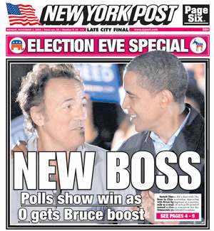 據(jù)美國《紐約郵報(bào)》3日報(bào)道,美國當(dāng)?shù)貢r(shí)間11月2日,奧巴馬一家在俄亥俄州克利夫蘭的競選集會上與著名美國搖滾歌手布魯斯斯普林斯廷同臺獻(xiàn)藝。新一輪民調(diào)顯示,離大選還有最后一天,奧巴馬已經(jīng)贏了。該報(bào)封面用“新老板”來稱呼勝利在望的奧巴馬。該報(bào)稱:斯普林斯廷用歌聲表達(dá)了對奧巴馬的贊揚(yáng)。據(jù)悉,1984年大選中,獲勝的里根曾引用斯普林斯廷的歌詞以爭取年輕人的選票。