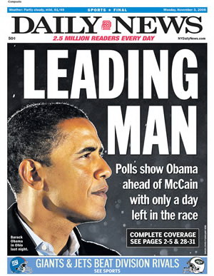 中新網(wǎng)11月4日電 據(jù)星島環(huán)球網(wǎng)報(bào)道,在大選投票還有最后一天之際,《紐約郵報(bào)》和《紐約每日新聞》等美國主要報(bào)紙11月3日在頭版都提前刊登了奧巴馬獲勝,成為白宮新主人的消息。