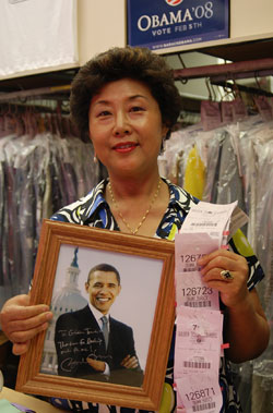 之前的30多年里,這家洗衣店是由另外一位韓國人經(jīng)營,姜女士是在去年剛接手過來的。她表示:“聽之前的店主人說‘奧巴馬1992年和妻子米歇爾結(jié)婚后就成了我們店的?汀。即使在競選期間,他每周也送洗兩次衣服!闭f著,她還展示了奧巴馬的照片和他開出的回執(zhí)。