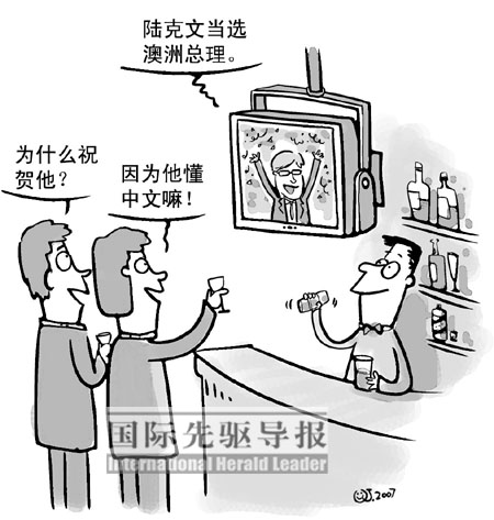 11月24日,澳大利亞聯(lián)邦大選,工黨勝出,50歲的陸克文成為澳大利亞新總理。有人說,陸克文是澳大利亞的布萊爾。這兩位政治明星都充滿活力、富有親和力、相貌俊朗,而且同為工黨領(lǐng)袖,除了陸克文能講一口流利的漢語之外,其他相似之極。