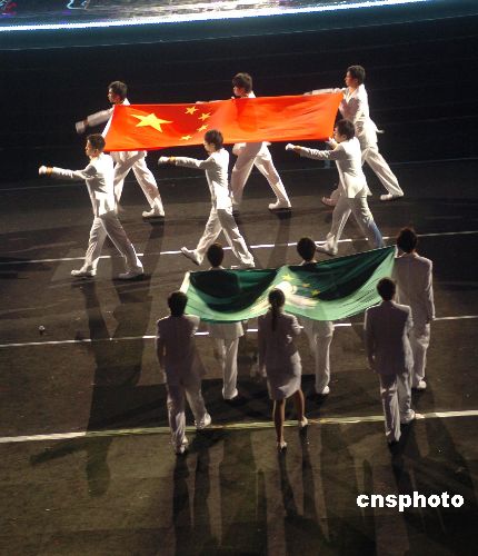 十月二十六日晚,中華人民共和國國旗和澳門特別行政區(qū)區(qū)旗升起在澳門運(yùn)動場,第二屆亞洲室內(nèi)運(yùn)動會開幕式隆重舉行。澳門特首何厚鏵、國際奧委會主席羅格等嘉賓出席開幕式。開幕式上舉行了“和諧澳門,快樂竟技”大型文體匯演。第二屆亞洲室內(nèi)運(yùn)動會將舉行十七個大項,一百五十一個小項非奧運(yùn)項目比賽和三個示范項目表演,是澳門主辦的規(guī)模最大,要求最高,比賽項目最多的國際綜合運(yùn)動會。 中新社發(fā) 史利 攝