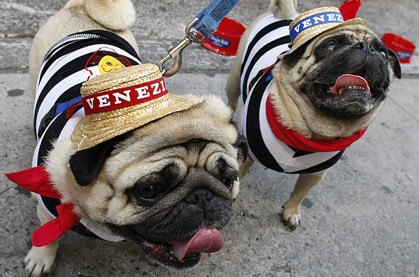 圖片七:哈巴狗馬克思和哈勃身穿橫條背心,脖系紅領(lǐng)帶,頭戴草帽,打扮成稱(chēng)威尼斯鳳尾船船夫的模樣。(鐘巖)