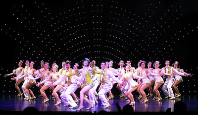 《42街》精妙絕倫的踢踏舞是觀眾最值得期待的表演。不同于傳統(tǒng)愛(ài)爾蘭踢踏舞的嚴(yán)肅、西班牙佛朗朗哥古典芭蕾的優(yōu)柔和現(xiàn)代舞的活力與動(dòng)感,《42街》以輕盈、歡快的美國(guó)踢踏舞為主,每一幕都可以看到眾多舞姿精湛的踢踏舞演員和著節(jié)拍輕踏雙腳。在節(jié)奏強(qiáng)勁的音樂(lè)聲中,上百只鮮艷的舞鞋在木地板上咔咔作響,聲勢(shì)浩大,規(guī)?涨。