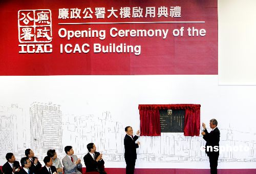 香港廉政公署新大樓十二月八日揭幕,中國最高人民檢察院檢察長(zhǎng)賈春旺和行政長(zhǎng)官曾蔭權(quán)出席開幕典禮。曾蔭權(quán)在開幕禮時(shí)表示,廉署成立30多年來,都致力維持本港重要核心價(jià)值,對(duì)貪污作出“零”容忍。他相信,廉署人員會(huì)繼續(xù)無畏和不偏不依,為香港服務(wù)。曾蔭權(quán)與廉署專員湯顯明主持揭幕禮。 中新社發(fā) 王麗南 攝