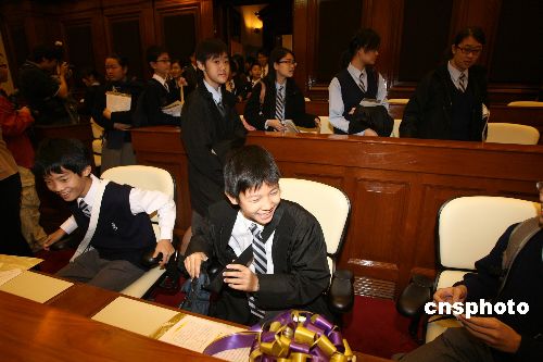 圖為同學們在議員的座位上體驗當議員的感覺。