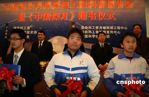 十二月十四日下午,國防科學(xué)技術(shù)工業(yè)委員會(huì)、中國科學(xué)技術(shù)協(xié)會(huì)、共青團(tuán)中央在此間中國科技館舉行贈(zèng)書儀式,向北京青少年學(xué)生代表贈(zèng)送由國防科工委月球探測中心組織專家編寫的《中國探月》一書,以激勵(lì)青少年學(xué)生更多了解中國首次月球探測工程相關(guān)知識,關(guān)注航天科技發(fā)展、崇尚科學(xué)、積極探索未知領(lǐng)域。中新社發(fā) 孫自法 攝