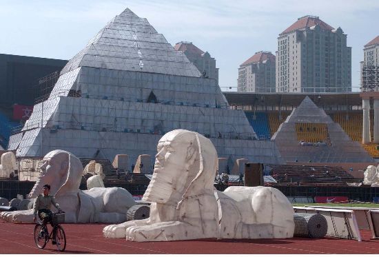 一座高達(dá)四十七米的金字塔模型曾出現(xiàn)在北京工人體育場。這里正在搭建世界超大型景觀歌劇《阿依達(dá)》的舞臺。該舞臺面積達(dá)六千多平方米。作為北京國際戲劇演出季的重頭劇目,《阿依達(dá)》上演。以后這種活動(dòng)可能要繳費(fèi)。中新社發(fā) 張煒 攝