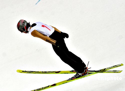 2008年1月23日上午,男子K90M個(gè)人跳臺滑雪開始比賽,全國冬運(yùn)會第六天哈爾濱亞布力滑雪場下起了小雪,對此項(xiàng)比賽有所影響。通化市運(yùn)動員田占東一跳奪冠,二三名分別被通化市另外兩位運(yùn)動員李洋和王建勛獲得。中新社發(fā) 姚庭山 攝