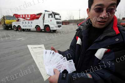 楊先生回憶說,昨天凌晨2時,他的貨車突然壞在北苑路上,被巡邏的交通隊發(fā)現(xiàn),并撥打了新通拖車公司電話。新通公司來后把掛鉤掛在楊先生的車上,并告訴他:“拖車出場費是6000元,掛上你的車就要5000元,另外每公里收費一百元。”“沒想到車還沒拖就得交11000元,我當時就不想拖了,可對方告訴我,拖車是他們的責任,而且鉤子已經(jīng)掛上了我的車,就算不拖了還是要交錢。”楊先生氣憤地說。昨天早上6點左右,新通公司將楊先生的車拖到了位于豐臺的公司,除了出場費、掛車費和36公里的里程費總共算下來一共要14600元。