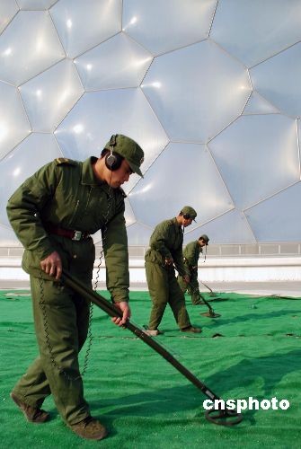 解放軍工兵正對北京奧運(yùn)場館“水立方”外圍實(shí)施防爆安全檢查。