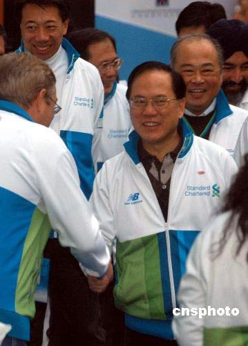 特區(qū)行政長官曾蔭權(quán)到尖沙咀彌敦道起步點(diǎn),主持馬拉松開跑儀式。