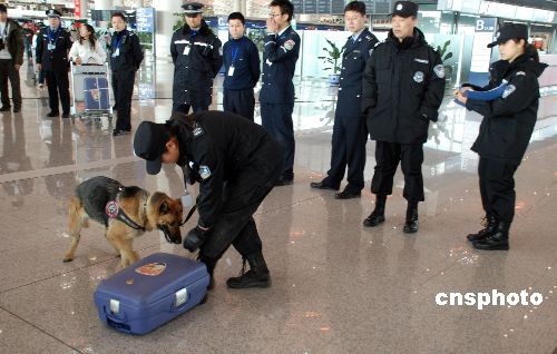 圖為機(jī)場工作人員正在利用警犬檢測行李中的危險(xiǎn)品。