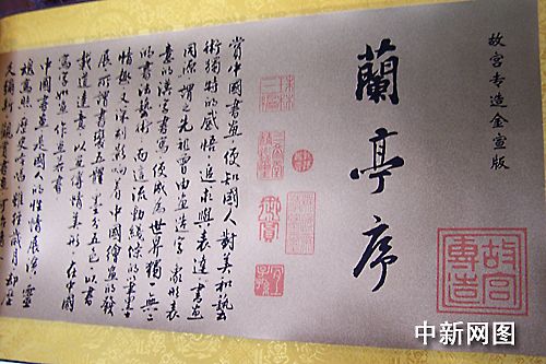 2006年11月15日,由中國(guó)故宮博物院監(jiān)制的全幅長(zhǎng)七米,寬三十五厘米的黃金珍藏版《蘭亭序》長(zhǎng)卷在書(shū)圣王羲之曲水流觴之地-紹興蘭亭所在地正式發(fā)行。據(jù)悉,此黃金珍藏版《蘭亭序》長(zhǎng)卷在浙江尚屬首發(fā)。