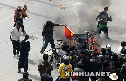 3月14日,一群不法分子在西藏自治區(qū)首府拉薩市區(qū)的主要路段實施打砸搶燒,焚燒過往車輛,追打過路群眾,沖擊商場、電信營業(yè)網(wǎng)點和政府機關(guān),給當?shù)厝嗣袢罕娚敭a(chǎn)造成重大損失,使當?shù)氐纳鐣刃蚴艿搅藝乐仄茐。事后查明,這天,不法分子縱火300余處,拉薩908戶商鋪、7所學校、120間民房、5座醫(yī)院受損,砸毀金融網(wǎng)點10個,至少20處建筑物被燒成廢墟,84輛汽車被毀。有18名無辜群眾被燒死或砍死,受傷群眾達382人,其中重傷58人。拉薩市直接財產(chǎn)損失達24468.789萬元。