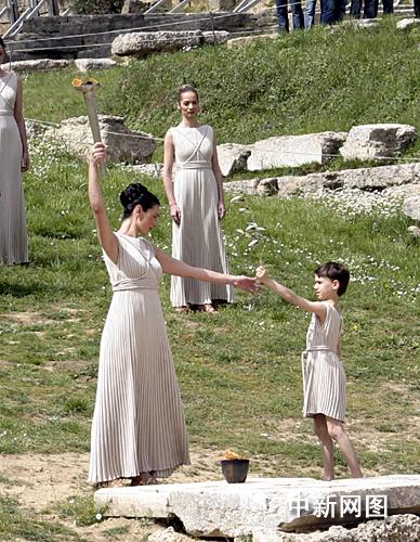 希臘當(dāng)?shù)貢r(shí)間3月24日,北京二00八年奧運(yùn)會(huì)圣火采集儀式在古奧林匹亞競(jìng)技場(chǎng)舉行,最高女祭司接過(guò)男孩敬獻(xiàn)的橄欖枝。中新社記者 王歡