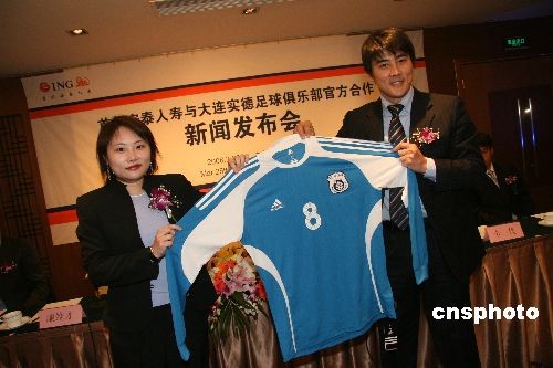 3月25日,在中超2008賽季開賽的前4天,大連實(shí)德足球俱樂部舉行新聞發(fā)布會?偨(jīng)理李明及主教練拉德科出席并正式宣告首創(chuàng)安泰人壽成為其官方合作伙伴。發(fā)布會上還展示了大連實(shí)德的中超2008賽季新隊(duì)衣。中新社發(fā) 大新 攝