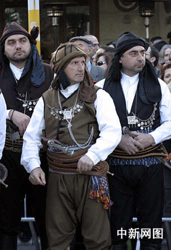 3月26日,北京奧運(yùn)會(huì)圣火希臘境內(nèi)傳遞第三日,抵達(dá)當(dāng)天最后一個(gè)城市韋里亞。當(dāng)?shù)厥忻袷⒀b參加慶典儀式。中新社記者 王歡