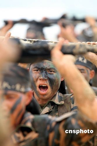 圖為中國(guó)陸戰(zhàn)隊(duì)員進(jìn)行沙灘體能訓(xùn)練。中新社發(fā) 李唐 攝