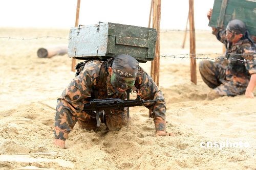 圖為陸戰(zhàn)隊(duì)員扛彈藥箱通過(guò)迂回鐵絲網(wǎng)。中新社發(fā) 李唐 攝