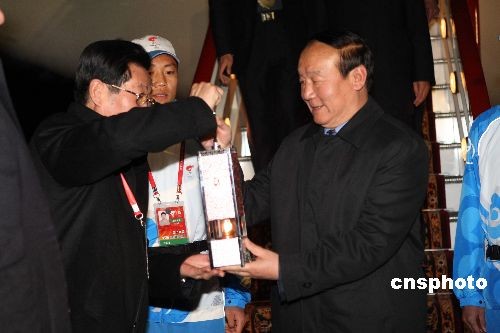 圖為北京奧組委執(zhí)行副主席蔣效愚(右)將圣火燈交給中國駐俄大使劉古昌。作者: 沈晨